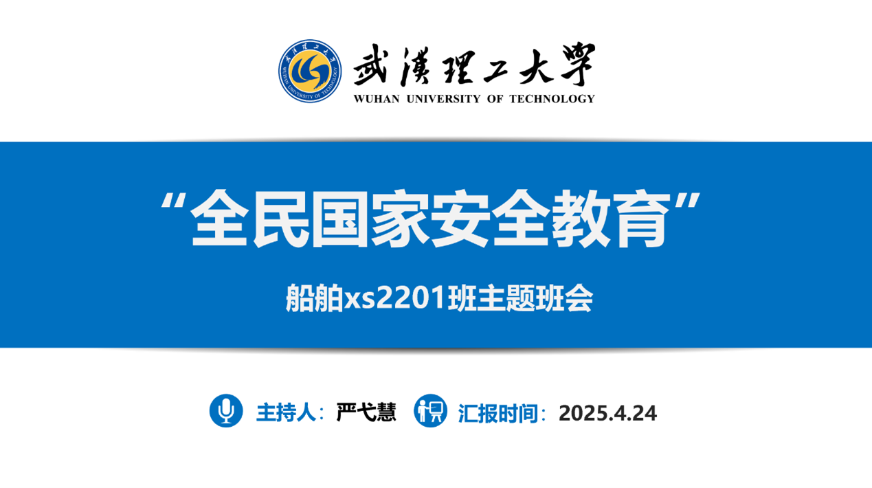为增强同学们的国家安全意识,树立正确的国家安全观,4月24日下午,船舶xs2201班在主楼325教室成功举办了以“全民国家安全教育”为主题的班会活动。本次班会由班长严弋慧主持,船舶xs2201班全体同学参与。