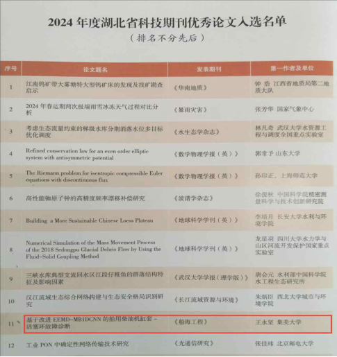 为激励广大科技工作者潜心基础研究与技术攻关,产出更多高水平、原创性科技成果并在我省科技期刊首发,助力全省一流科技期刊建设,受湖北省科学技术协会委托,湖北省科学技术期刊编辑学会组织实施了2024年度湖北省科技期刊优秀论文遴选工作。经省内各期刊社(编辑部)推荐、专家评审组初评和复评,确定入选优秀论文100篇,《船海工程》编辑部推荐的论文成功入选。