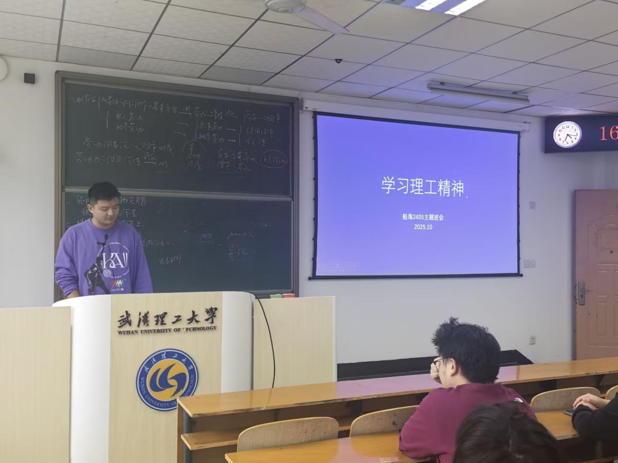 班会伊始,徐靖锴以“船海人的理工精神是什么”为引,分享了提前整理的图文课件,带着同学们重温了老一代造船工程师扎根船厂攻克技术难题的故事,还有当代船海领域科研团队在深海装备、绿色航运等方向的创新突破。分享结束后,他结合咱船舶与海洋工程专业的学习和实践,提炼出理工精神的核心:精准严谨的绘图态度、敢想敢试的创新意识、啃硬骨头的攻坚韧劲、护航海洋的责任担当,为后续的讨论和实践环节明确了方向。
