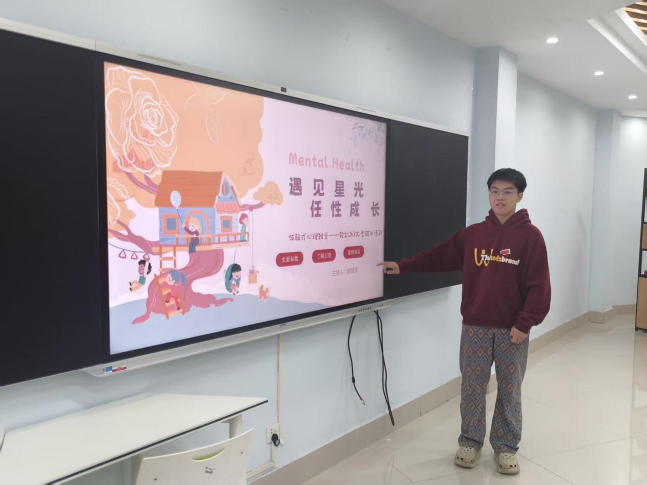 为了全方位引导同学们关爱自我、深入了解自我、坦然接纳自我,稳步提升心理健康水平,轮机2401班于11月16日晚九点在余十五舍463活动室顺利举办了一场别开生面且意义非凡的体验式心理班会大型破冰活动。本次班会以“遇见星光,任性成长”为主题,由柳锦淏同学担任主持人。