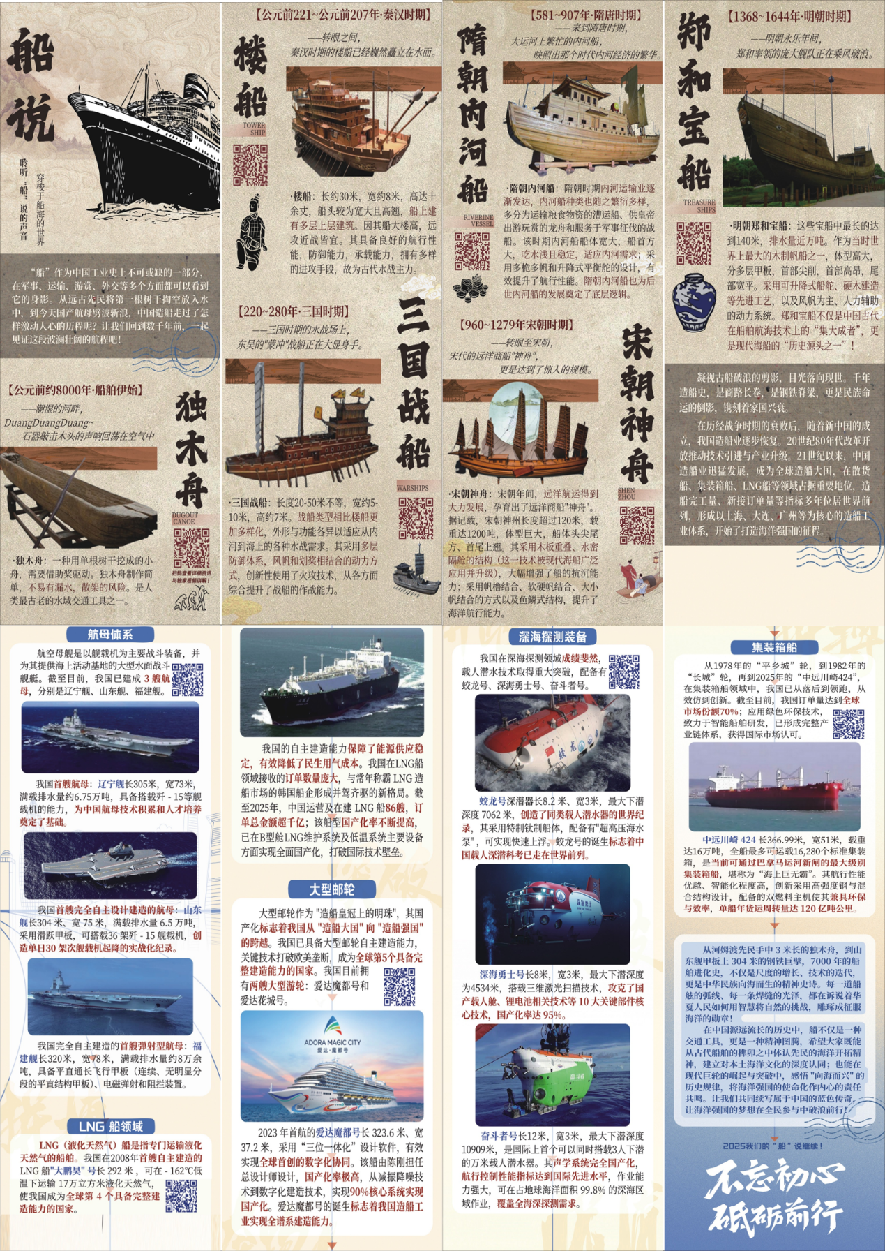 为深化团支部共建实践,推动专业学习与文化育人相结合,船舶xs2301团支部联合船舶xs2401团支部开展舟船文化科普教育共建活动,完成《船文》系列作品。作品以图文形式梳理中国船舶发展脉络,集中呈现我国船海事业的历史进程与时代成就,是一次以支部共建为载体、以专业学习为基础的科普实践。
