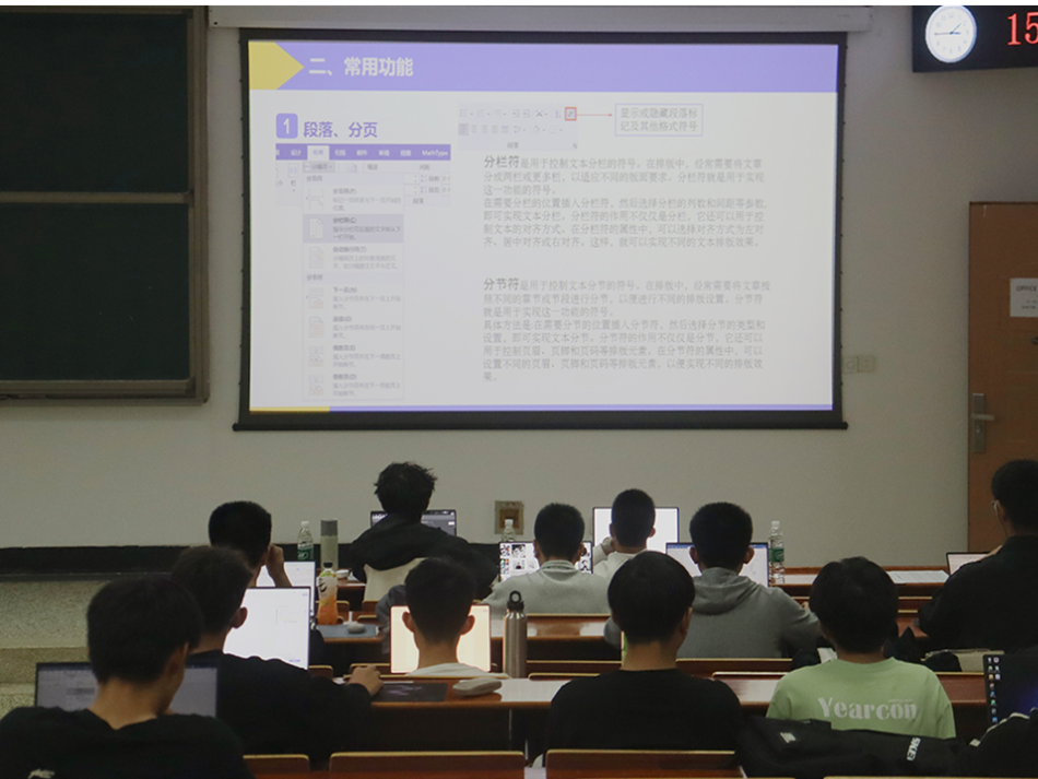 培训会上,唐艾苏学姐系统讲解了Word软件的基本操作与常用功能,包括文档排版、页眉页脚设置、目录自动生成、样式应用等实用内容。她通过现场演示,逐步展示了各项功能的具体操作步骤,帮助同学们直观理解并掌握Word的高效使用方法。此外,她还针对同学们在课前收集的常见问题,如页边距调整、图文混排、格式刷使用等,一一进行了详细解答。