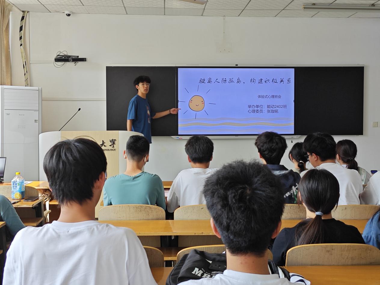 5月9日,船海能动学院能动2402班于航海楼608教室开展了“驶离人际孤岛,构建积极关系”体验式心理班会,旨在帮助同学们建立健康的人际关系,提高社交能力,引导同学们重新认识自我、理解他人。本次会议由心理委员张珈铭主持,二班全体同学参加。