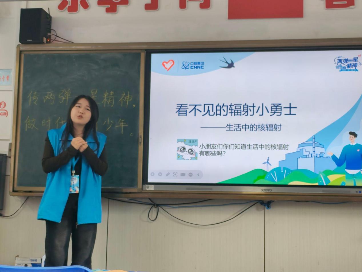 本次宣讲活动紧扣“传两弹一星精神,做时代强国少年” 的核心主题,分为知识讲解与趣味游戏两大板块,既注重理论科普的准确性,又兼顾小学生的认知特点。在知识讲解环节,志愿者们从“两弹一星”历史背景切入,用通俗易懂的语言讲述了老一辈科研工作者隐姓埋名、艰苦奋斗的感人故事,让同学们深刻理解“热爱祖国、无私奉献,自力更生、艰苦奋斗,大力协同、勇于登攀”的精神内涵。