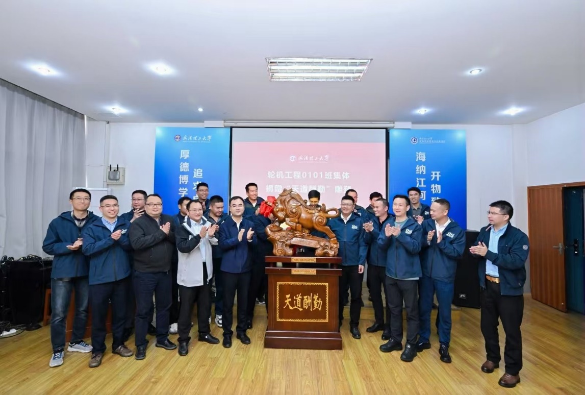 校友们还围绕行业趋势、人才培养建议、校企合作路径等话题展开热烈讨论,表达了与母校深化合作的强烈意愿。轮机工程0101班校友共同捐赠“天道酬勤”雕塑,既表感恩,也激励学子勤学笃实,传承理工精神。